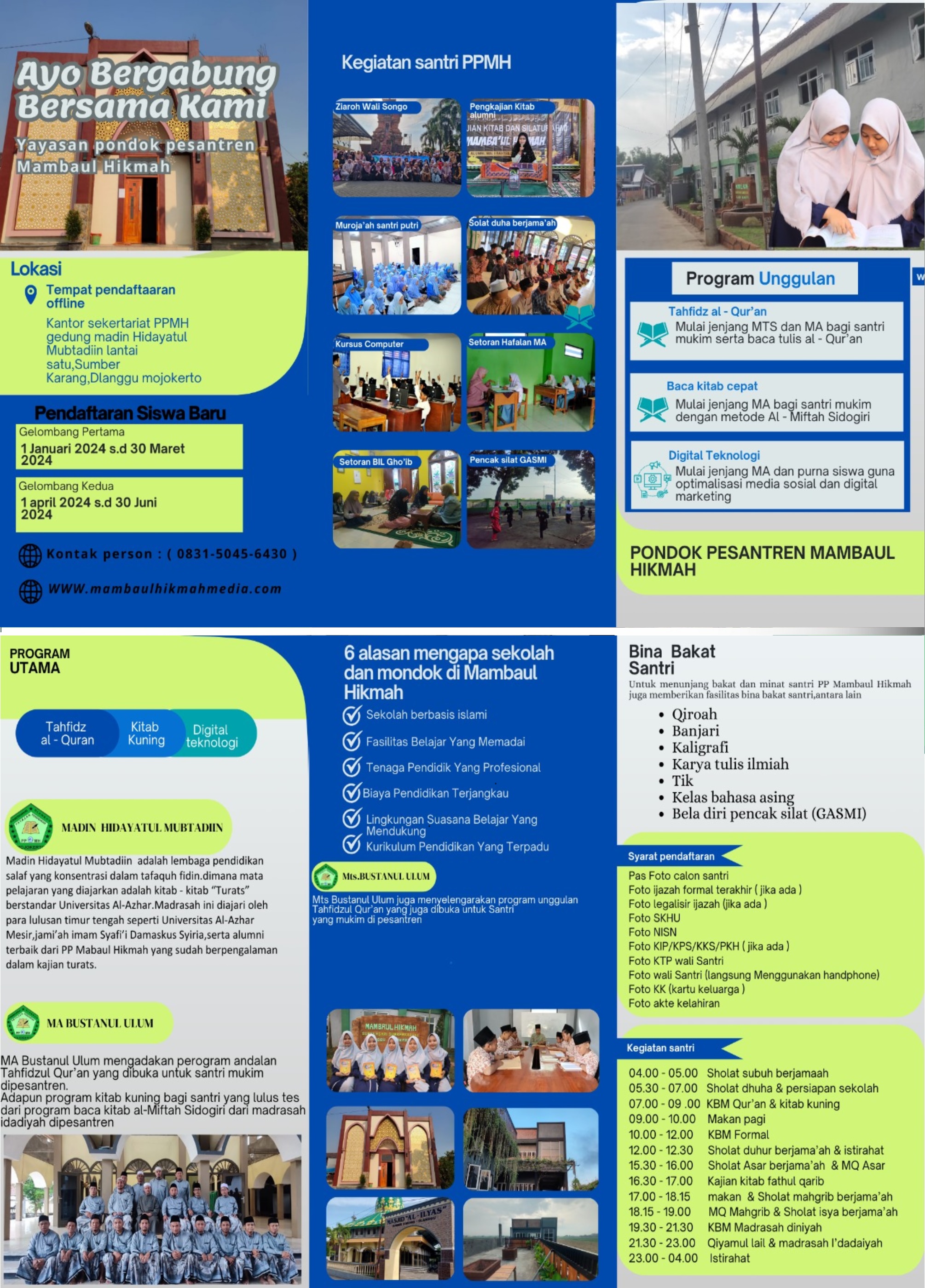 Lembaga Pendidikan Pondok Pesantren Mamba'ul Hikmah mengaktualisasikan pendidikan salaf dengan pendidikan modern untuk menumbuhkembangkan keimanan dan intelektualitas anak. Agar anak kelak menjadi sosok yang sholeh literasi, sholeh sosial, dan mandiri.